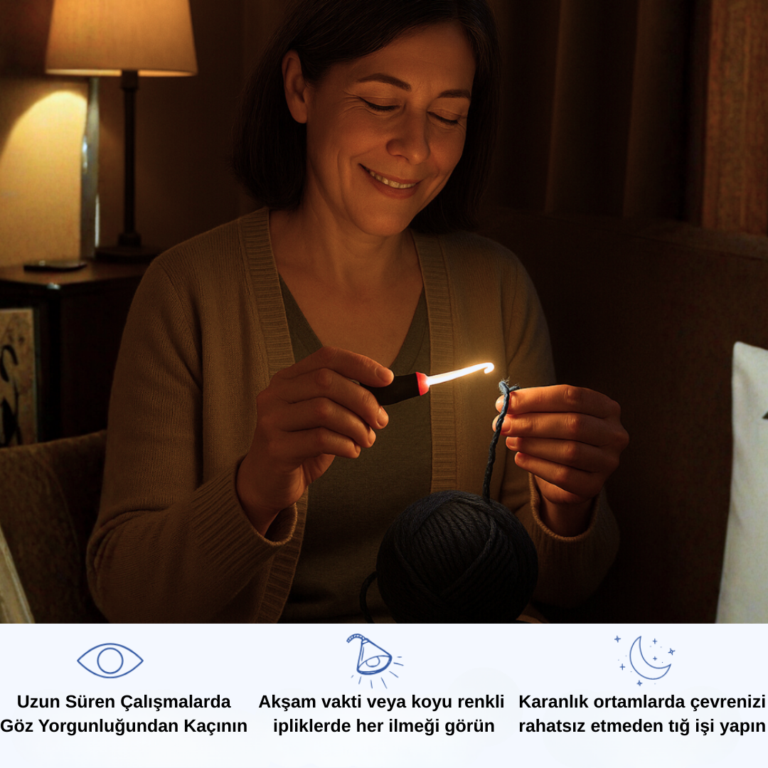 Işıklı tığ sayesinde gözlerini kısmaz, ilmek kaçırmazsın. Örgü daha hızlı ve daha keyifli hale geldiğini söyledi.